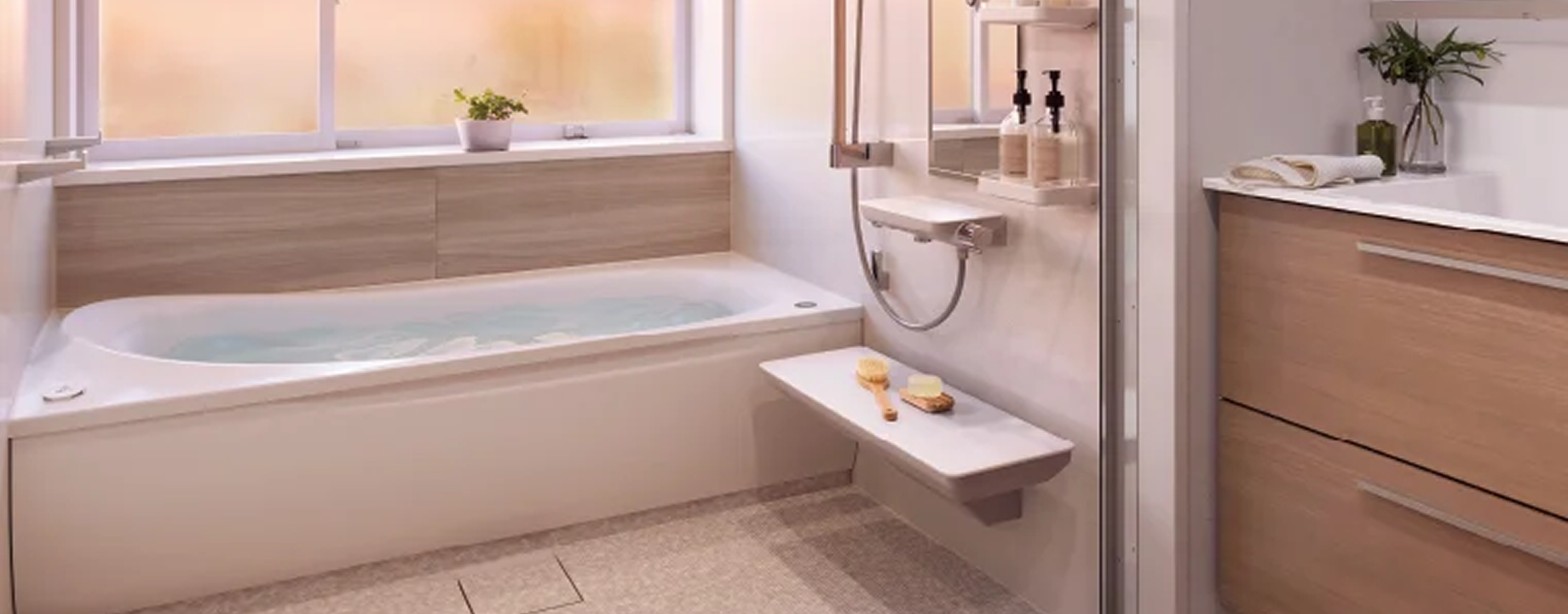 最近の浴室・浴槽は、昔に比べてどんどん大きくなっています。 ユニットバスが一般的になる前の浴室では実現が難しかった、ゆとりある空間も、リフォームを通じて快適にご提案できます。