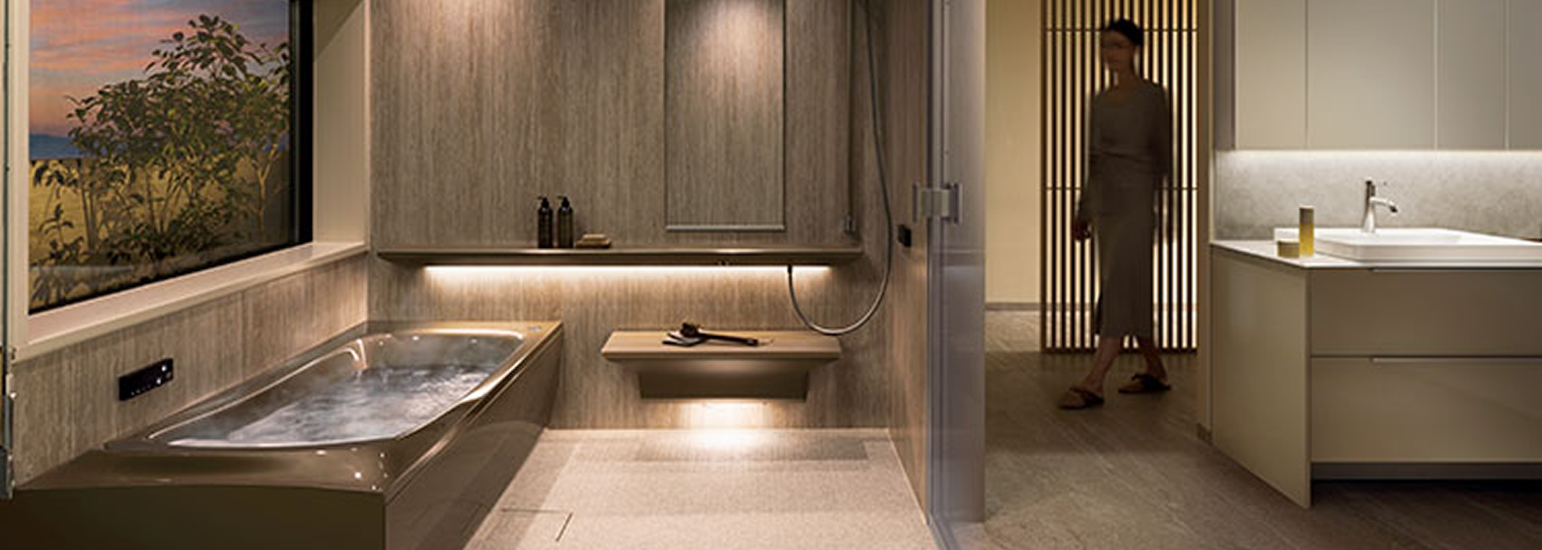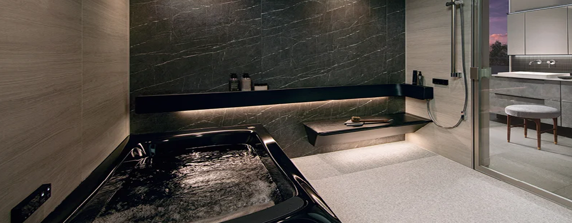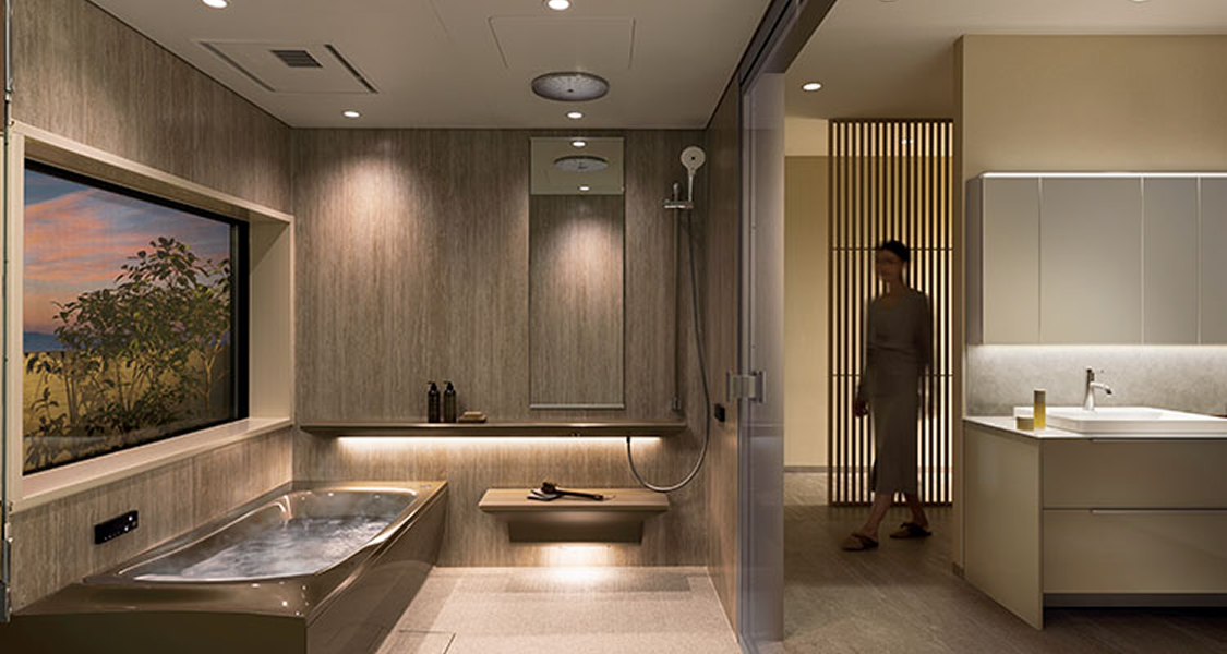 「シンラ」は、上質な癒しを追求した最上位モデルです。人間工学に基づいた浴槽は身体をやさしく包み込み、長時間でも快適な入浴を実現。肩楽湯・腰楽湯による心地よい水流が、まるでスパのようなリラックス体験を自宅でもたらします。間接照明や高級感のあるデザインで、浴室空間そのものがくつろぎの場に。さらに清掃性や断熱性にも優れ、快適さと美しさを長く保てるバスルームです。